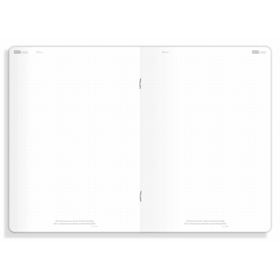 80 ponthálós, igés A4-es oldalt tartalmazó, tűzött lapbetét. Az oldalakon szereplő ige: „Aki hisz bennem, amint az Írás mondta, élő víz folyamai áradnak annak belsejéből.” (Jn 7,38)