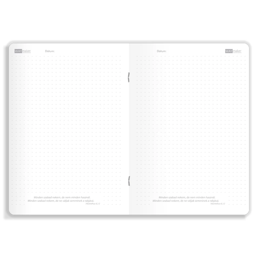 80 ponthálós, igés A5-ös oldalt tartalmazó, tűzött lapbetét. Az oldalakon szereplő ige: „Minden szabad nekem, de nem minden használ. Minden szabad nekem, de ne váljak semminek a rabjává.” (1Kor 6,12)