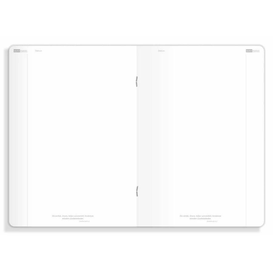 80 sima, igés A4-es oldalt tartalmazó, tűzött lapbetét. Az oldalakon szereplő ige: „Dicsérlek, Uram, teljes szívemből, hirdetem minden csodatettedet.” (Zsolt 9,2)