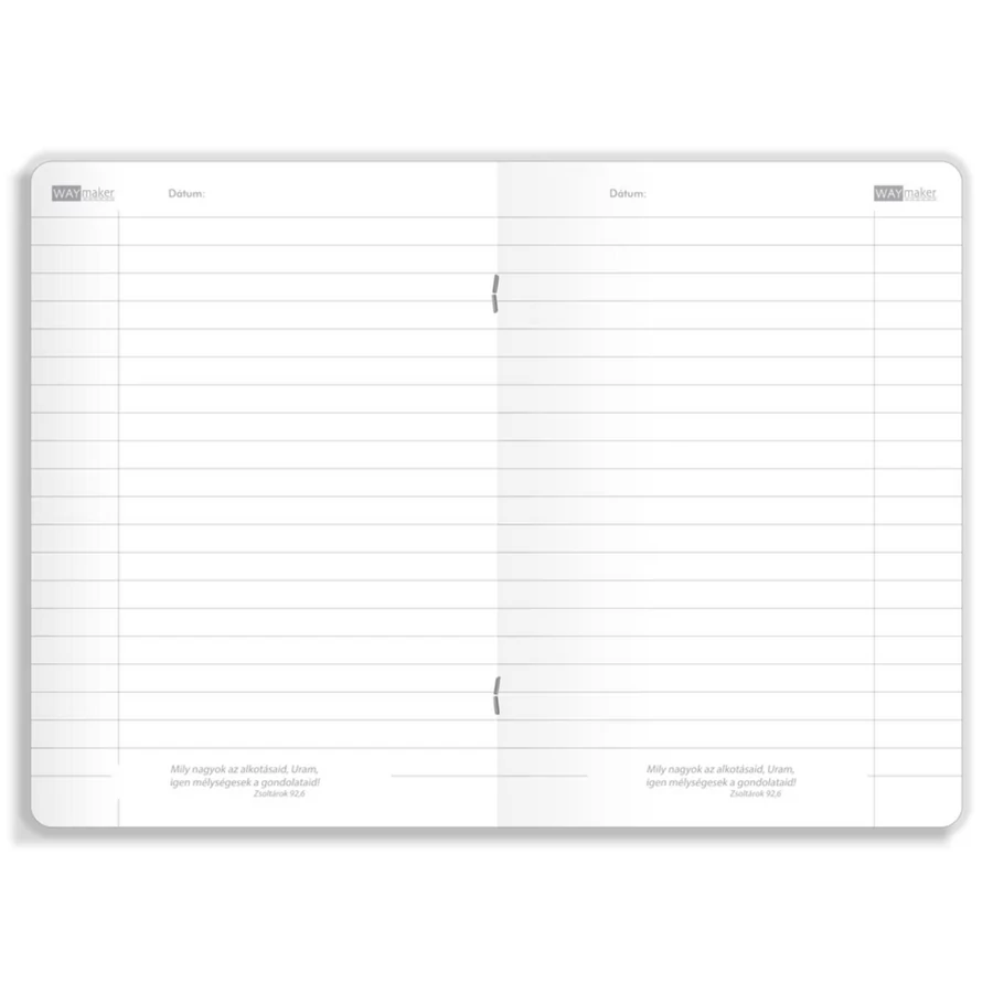 80 vonalas, igés A5-ös oldalt tartalmazó, tűzött lapbetét. Az oldalakon szereplő ige: „Mily nagyok az alkotásaid, Uram, igen mélységesek a gondolataid!” (Zsolt 92,6)