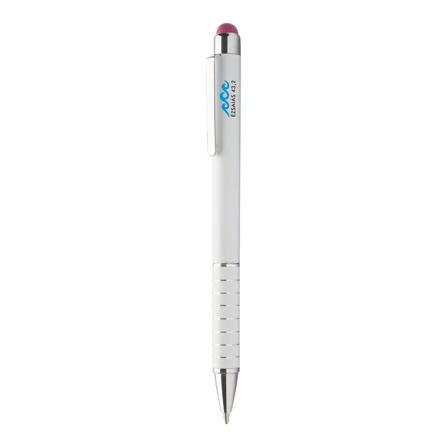 Alumínium, érintőképernyős golyóstoll fehér testtel és színes érintőgombbal. Kék tollbetéttel szállítjuk. Különböző színekben kapható: kék, narancssárga, pink, zöld.